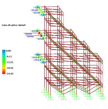 b. il caso di carico “sismaY” è stato applicato durante l’analisi con un moltiplicatore negativo per invertire il verso delle forze in figura. In pratica, viene assunto un centro di istantanea rotazione per il ribaltamento in corrispondenza delle cerniere in basso a sinistra
