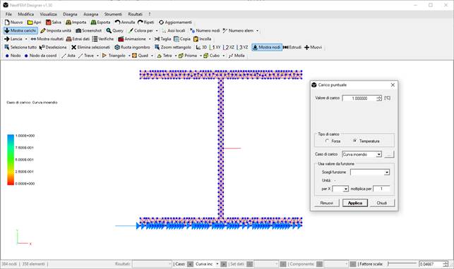 Prima di lanciare l’analisi si dovranno assegnare i carichi, che saranno di tipo puntuale nei nodi dell’ala inferiore del profilo HEA 300. Da Assegna / Carichi / Carico puntuale, dopo aver selezionato tutti i nodi presenti sul lato inferiore della sezione, si applicherà un carico Temperatura unitario, dal quale si potrà sviluppare l’incremento secondo la curva ISO 834.