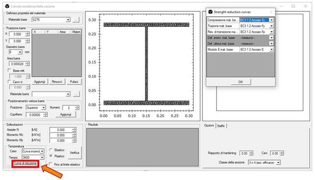 Scegliendo di operare in campo plastico, e specificando una Classe 1 o 2 per la sezione analizzata, una volta premuto il pulsante Verifica si otterrà il dominio resistenza, rappresentato graficamente nel riquadro di destra. Come si può evincere, a t=60 min. il profilo HEA 300 presenta una resistenza residua di 56.6 kNm, pari al 15.6% di quella propria della sezione a freddo.