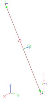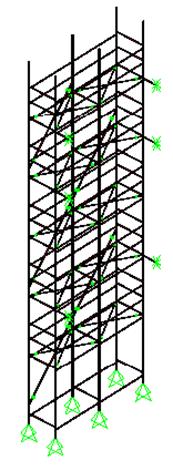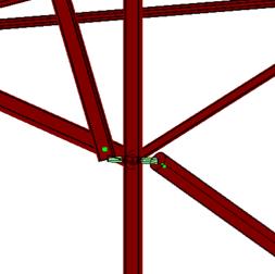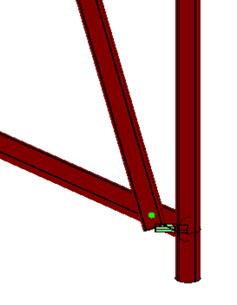 Il giunto è modellato come singolo elemento trave “tozzo”, cioè con una sezione trasversale di dimensioni comparabili alla sua lunghezza. Nella figura seguente, la diagonale di facciata si collega al montante attraverso un elemento asta ortogonale allo sviluppo della diagonale, che quindi reagirà a taglio. Riveste particolare importanza la snellezza di questo elemento: più è tozzo, più assorbirà sforzo di taglio, e di conseguenza aumenterà il carico assiale che transita nella diagonale, essendo la struttura iperstatica. Appare un buon approccio utilizzare una sezione trasversale con area più o meno pari a quella del bullone di collegamento, tenendo in debita considerazione anche la luce libera di tale perno.