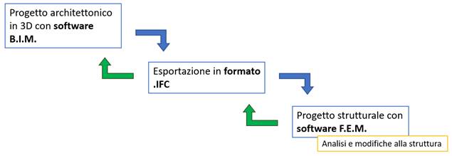 Nella progettazione strutturale, il flusso operativo BIM è rappresentato dall’iterazione continua tra il progettista architettonico, che genera il modello geometrico del progetto sulla base delle indicazioni del Committente, e il progettista strutturale, che calcola la struttura e ne modifica le componenti per adeguarle ai calcoli.
