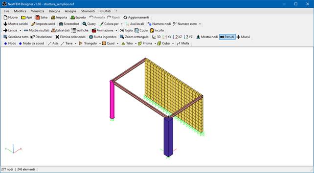 Inoltre NextFEM Designer ha la possibilità di esportare modelli strutturali in file IFC. Ad esempio, si consideri una semplice struttura a pianta rettangolare di dimensioni 3,00x5,00m, altezza 3,00m, costituita da pilastri in cemento armato e travi IPE 180, in acciaio S275, ancorata ad un setto in calcestruzzo C25/30 di sezione 0,18m. A fini dimostrativi, i pilastri presentano sezione rettangolare 40x40cm e una circolare di diametro 30cm. Una volta modellata la geometria in Designer ed assegnate le armature, si procede all’esportazione del modello in formato IFC mediante il comando File / Esporta... e selezionando IFC model (*.ifc) dal menu a tendina.