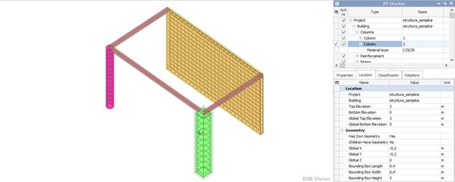 Selezionando ad esempio il pilastro a sezione quadrata, si avranno accesso ai dati quali ad esempio profilo IFC, dimensioni e collocazione nello spazio modello. Grazie a queste informazioni il modello potrà essere interpretato da altri software e scambiato tra tutti i professionisti coinvolti nel progetto.