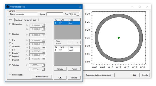Per i pilastri circolari si parte dalla definizione di una sezione tubolare di dimensioni assegnate (D=0.30m, t=0.02m) utilizzando il comando Modifica / Sezioni. In seguito, facendo doppio click sulla sezione appena creata, o alternativamente cliccando sul pulsante Modifica proprietà, si apre la finestra di dialogo che consente di scegliere il tipo di figura. Nel caso in esame si andrà a spuntare la voce Personalizzata nella scheda Tipo, definendo le caratteristiche del pilastro interno in c.a. nella successiva maschera Aggiungi. L’inserimento di una nuova sezione avviene rispetto al baricentro della prima sezione inserita, visualizzato graficamente dal punto verde nel grafico della finestra Sezioni.