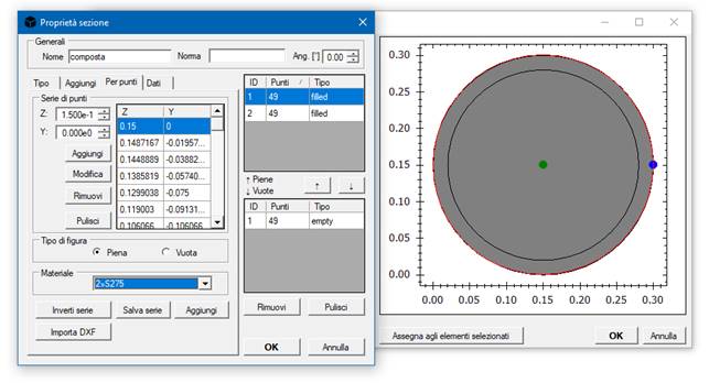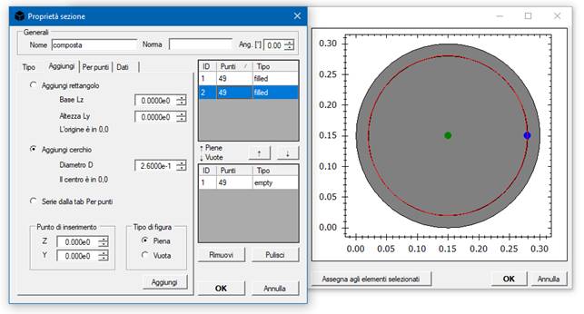 Si ottengono due sezioni, la numero 1 corrispondente al tubolare in acciaio, la numero 2 al pilastro pieno in calcestruzzo armato.