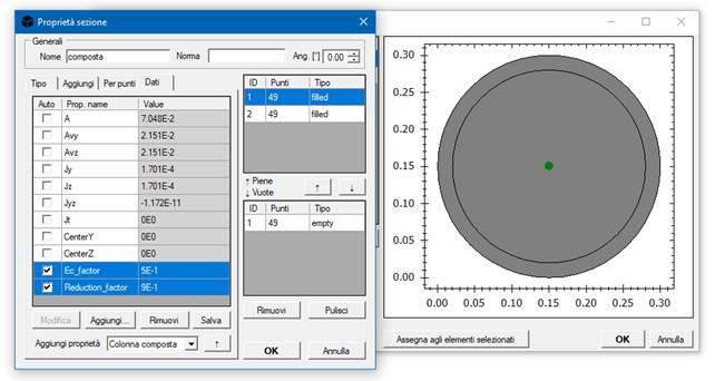 Le restanti proprietà sono calcolate dividendo il contributo del calcestruzzo per il coefficiente di omogeneizzazione n. Le proprietà specifiche dell’elemento considerato devono essere selezionate dal menu a tendina Aggiungi proprietà, scegliendo Colonna composta e cliccando il pulsante laterale per la loro immissione nei dati.