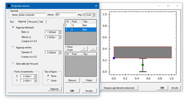 In questo caso viene prima scelto il tipo IPE 240 dal database precaricato nel programma utilizzando il menu a tendina Sezione trave nella maschera Sezioni. Si procede aggiungendo la soletta, ovvero una nuova sezione rettangolare piena dalla maschera Aggiungi, di base Lz=1m ed altezza Ly=0.2m. L’inserimento deve tenere conto delle dimensioni della trave in acciaio, di conseguenza le coordinate del Punto di inserimento (rappresentato dallo spigolo inferiore sinistro) sono calcolate in Z=-0.44m e Y=0.24m rispetto al baricentro di quest’ultima (per posizionare la soletta in mezzeria al di sopra della trave).