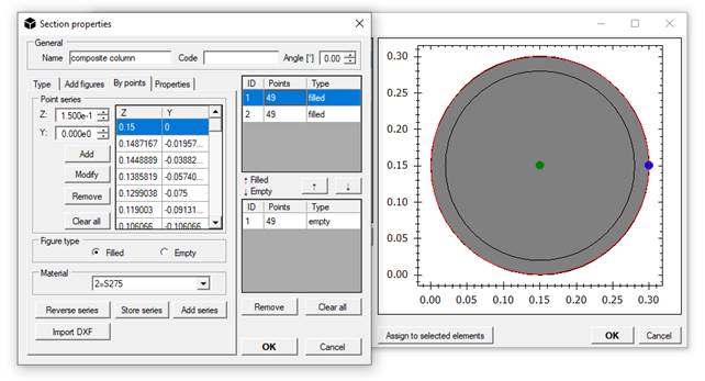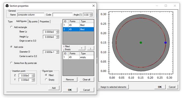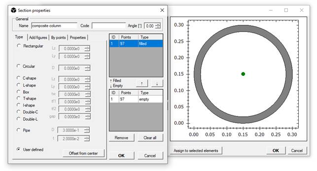 For circular columns, we start by defining a pipe section with assigned dimensions (D = 0.30m, t = 20mm) using the Edit / Sections command. Then, by double clicking on the section just created, or alternatively clicking on the Edit properties button, you can choose the shape of the section in the dialog box that appears. In this case we must select User defined in the Type tab, as per defining the characteristics of the internal column in reinforced concrete in the following Add figures mask. The input of a new section takes place with regard to the centre of gravity of the first inserted section, graphically shown by the green dot in the graph of the Sections window.