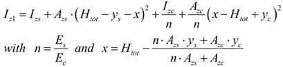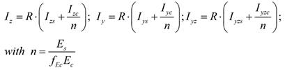 The geometric characteristics of the composite section are automatically calculated within the Properties tab, taking into account the contributions of the different materials. In accordance with Eurocode 4, the moments of inertia are normalized with respect to steel: