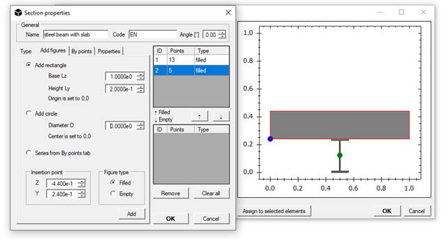 In this case, the IPE 240 shape is chosen from the built-in database, by using the Beam section drop-down menu in the Sections window. Then we add the slab by a new rectangular filled shape with the Add figures mask, with base Lz = 1m and height Ly = 0.2m. The insertion must take into account the dimensions of the steel beam, consequently the coordinates of the insertion point (represented by the lower left corner) are calculated in Z = -0.44m and Y = 0.24m with respect to the centre of gravity of the steel beam (in order to place the slab in the middle above the beam).