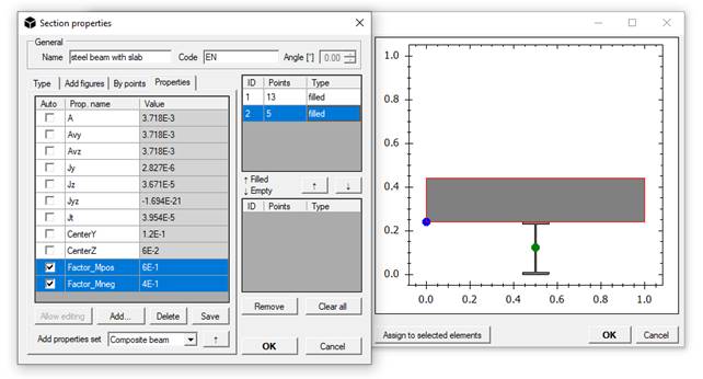 As seen before, the materials are assigned from the By points tab by selecting the rows corresponding to the sections just created from the table on the right, while in this case the characteristics of the Composite Beam of Add properties set of the Properties tab must be added. The moment of inertia for negative decrease is given by the contribution of steel only, considering the section in reinforced concrete cracked, while the moment of inertia due to positive bending is given by:
