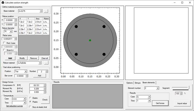 To enter the forces obtained from the calculation, use the Beam elements mask at the bottom right. Select the structural element from the drop-down menu (to see the number of the element on the screen press F8 or select Element number from View / View controls mask), choose the desired section of the element with the horizontal cursor and specify the load case and the instant of time (for linear analyses it is always 1, conventionally). The Get forces button imports the forces for the chosen section to perform the calculation.