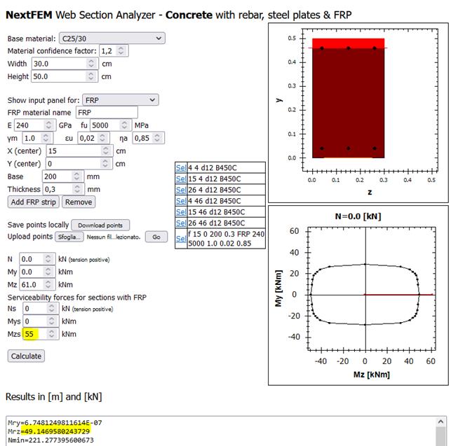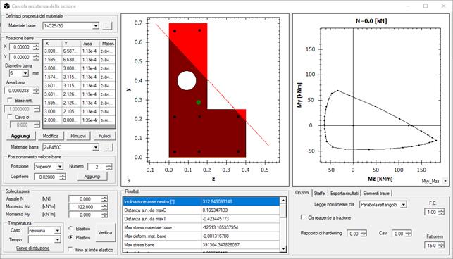 Il programma di fornisce il momento resistente (Mrz=66.2kNm), il plot dell’asse neutro e del dominio resistente nel piano My-Mz. La sezione è verificata, e lo stato dell’FRP è specificato nell’output testuale: