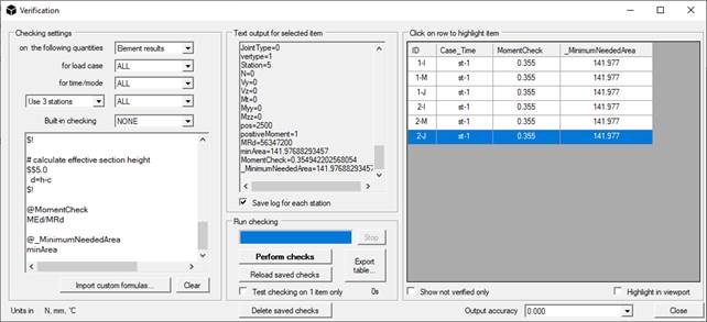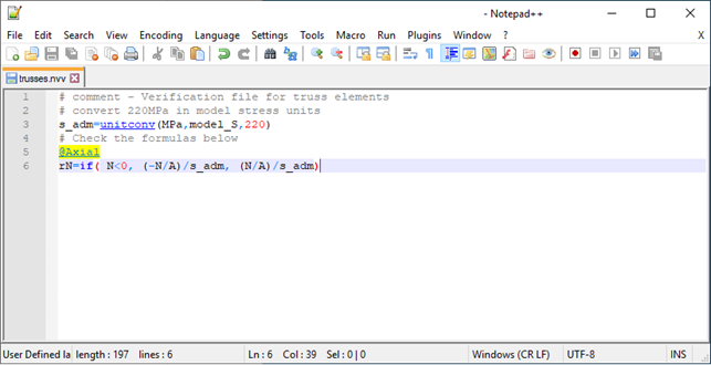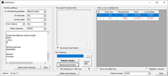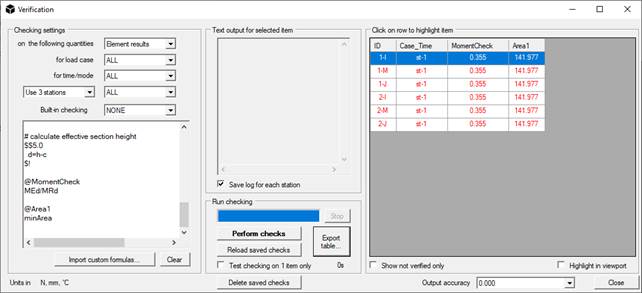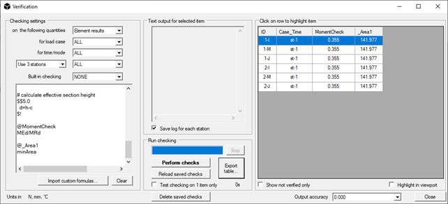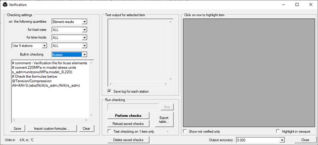 Lo script deve essere caricato nella finestra Verifica ( comando Risultati / Verifiche ... ); per fare ciò, creare un file di testo e inserirlo nella sottocartella "verifica" nella directory di installazione del programma (in genere è C: \ Programmi \ NextFEM \ NextFEM Designer \ verification ).