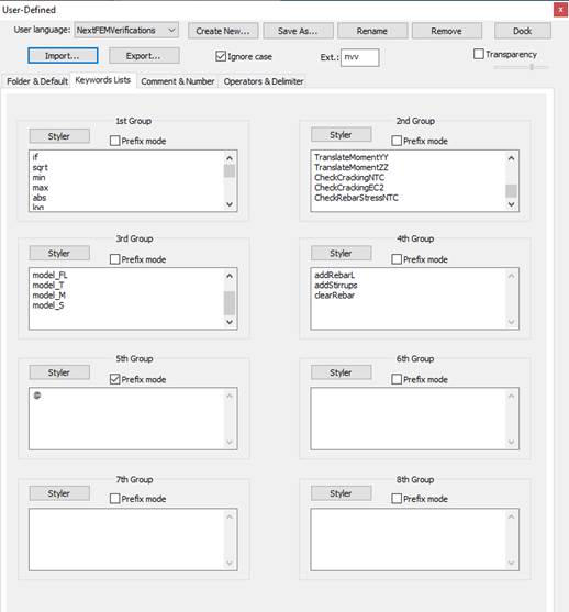 È possibile trovare un'impostazione per l'evidenziazione della sintassi per Notepad ++ nella cartella " verifica " ( NextFEMVerifications.xml ). Da dentro Notepad ++, può essere caricato con il comando Language / Define your language ... e facendo clic su Importa ... . Quindi, troverai la voce " NextFEMVerifications " nel menu a tendina in alto. Inoltre, nella scheda Elenchi di parole chiave , puoi vedere tutti i comandi supportati per lo scripting che saranno evidenziati durante la modifica.