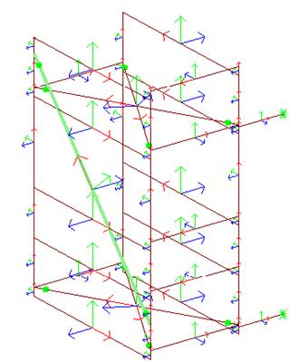 Il giunto è modellato come singolo elemento trave “tozzo”, cioè con una sezione trasversale di dimensioni comparabili alla sua lunghezza. Nella figura seguente, la diagonale di facciata si collega al montante attraverso un elemento asta ortogonale allo sviluppo della diagonale, che quindi reagirà a taglio. Riveste particolare importanza la snellezza di questo elemento: più è tozzo, più assorbirà sforzo di taglio, e di conseguenza aumenterà il carico assiale che transita nella diagonale, essendo la struttura iperstatica. Appare un buon approccio utilizzare una sezione trasversale con area più o meno pari a quella del bullone di collegamento, tenendo in debita considerazione anche la luce libera di tale perno.