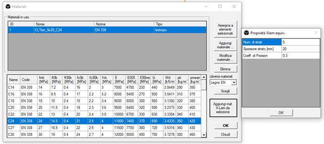 Indicando il numero di strati, lo spessore del singolo strato e il rapporto di Poisson da utilizzare, il programma produce un nuovo materiale, chiamato CLTiso_5x20_C24, che sfrutta l’equivalenza di Blass-Fellmoser per la sua definizione.