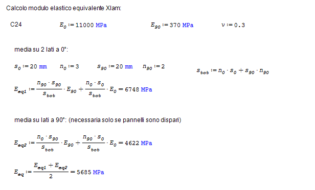 Quindi, nel nostro modello i pannelli costituiti da 5 strati di 20mm ciascuno di legno C24 (E0=11 GPa ed E90=370 MPa) avranno un modulo elastico equivalente pari a E=5685 MPa.