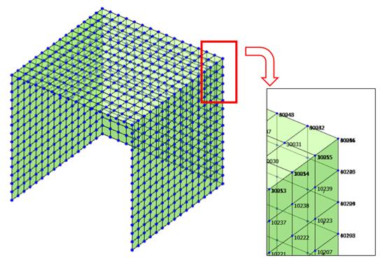 Con questa procedura, modelliamo ad esempio un insieme di pareti come nella figura sottostante. Si noti come i nodi d’angolo delle pareti siano raddoppiati: questo permetterà l’installazione delle molle.
