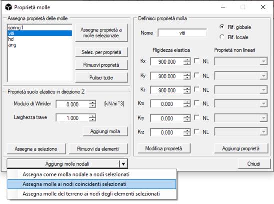 Basterà ora selezionare con il rettangolo di selezione i (doppi) nodi interessati dalle molle e selezionare il comando Aggiungi molle nodali / Assegna molle ai nodi coincidenti selezionati.
