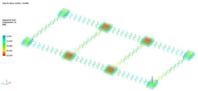 Andiamo ora a controllare le sollecitazioni nelle molle del suolo. Trattandosi di molle a lunghezza nulla, i loro assi locali sono quelli globali, quindi leggiamo trazione o compressione del suolo in corrispondenza di “Diagrammi travi”, componente Vz.