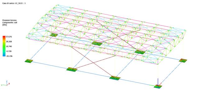 Come si evince dai risultati, il modello presenta ancora delle trazioni, dovute principalmente al caso di carico da vento, di cui possiamo apprezzare la deformata e visualizzare il sollevamento dei plinti (struttura soggetto a solo vento, senza altri carichi verticali né peso proprio).