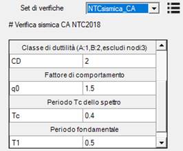 - Per le verifiche di duttilità: il fattore di comportamento q0, il periodo Tc dello spettro di progetto; il periodo fondamentale da considerare nella verifica T1.
