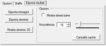 Esporta risultati contiene le opzioni del programma per plottare la tensione nelle barre di armatura e per personalizzare, oltre ad altri comandi per esportare le immagini della sezione analizzata o i punti del dominio resistente, oppure visualizzare il dominio in 3D.