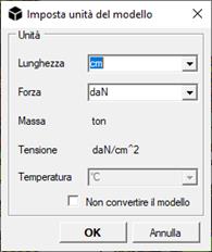 Imposta unità: Da qui possono venire selezionate le unità di misura desiderate nel modello. Le unità di default sono sempre m, kN e °C.
