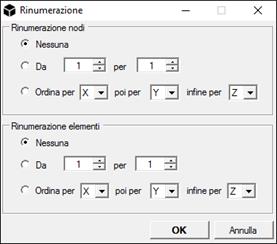 Rinumerazione: Rinumera nodi e/o elementi secondo i criteri specificati.