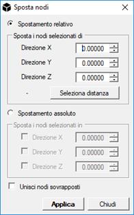 Sposta nodi: Selezionando Spostamento relativo, Sposta i nodi selezionati della quantità specificata. Selezionando Spostamento assoluto, sposta i nodi nelle direzioni selezionate alle coordinate specificate.