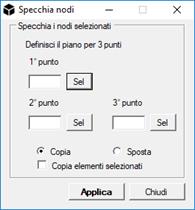 Specchia nodi: Specchia i nodi selezionati (e opzionalmente gli elementi) rispetto ad un piano nello spazio 3D definito da 3 punti.