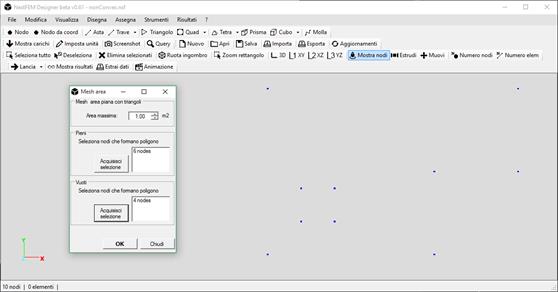 Mesh area: Per meshare automaticamente un’area in elementi triangolari, selezionare dalla maschera la massima area dell’elemento Tria da generare, i nodi di perimetro per le zone da meshare e i nodi di perimetro di eventuali buchi all’interno della mesh. Dopo aver selezionato i nodi, premere Acquisisci selezione per associare i nodi al gruppo Pieni. Per inserire un buco nella mesh, operare allo stesso modo per associare i nodi al gruppo Vuoti. Per procedere premere OK.