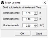 Mesh volume: Questo comando permette di meshare elementi solidi in elementi tetraedrici. L’opzione Dimensione max specifica la massima lunghezza caratteristica da attribuire a ciascuno; Dimensione min la dimensione minima e Gradiente mesh la variazione massima percentuale fra un elemento e un altro. Premere OK per procedere con gli elementi selezionati.