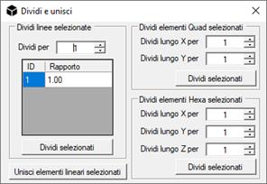 Dividi e unisci: Questo comando permette di dividere in parti gli elementi line a 2 nodi e quad a 4 nodi selezionati. Inoltre, è possibile unire in un solo elemento gli oggetti line selezionati, aventi lo stesso primo asse locale.