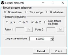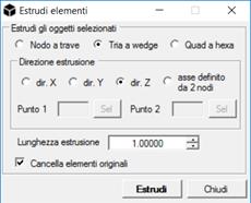 Estrudi elementi: Questo comando permette di estrudere elementi da nodi, tria o quad selezionati. In tutti i casi, l’utente deve specificare la Direzione di estrusione e la Lunghezza di estrusione.