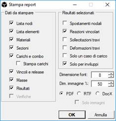 Stampa report: Produce un report in formato PDF, RTF o DocX. Selezionare le voci desiderate per includerle nel report.