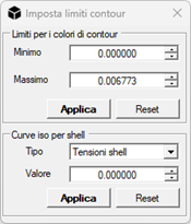 Imposta limiti del contour: Permette di settare i limiti della vista a gamma di colori corrente a dei valori limite scelti dall’utente. La maschera contiene anche dei comandi per tracciare delle isocurve nella vista corrente per gli elementi shell (temperatura, stress o forze).