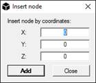 Node by coordinates: Inserts nodes by coordinates. To insert a nodes by coordinates, insert them on the textboxes and then click on the Add button. It is possible to insert nodes until the Close button is pressed.