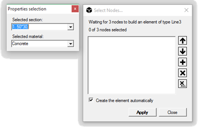 Beam: Inserts beam elements between two nodes. To insert a beam element select a section and a material from , if it has already been defined, from Selected section drop-down menu in the Section selection window and then click on the nodes to be connected. Once finished click on the Close button in the Selected nodes window.